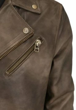 Ab aufs Bike! Mit der Lederjacke VICK BIKER aus dem Hause GOOSECRAFT steht einem Ausritt optisch nichts im Weg. Die typischen Elemente wie asymmetrisches Revers, Steppungen an den Ellenbogen, Zipper an den Ärmelenden und tonale Trennungsnähte dürfen natürlich nicht fehlen. Der Reverskragen kann durch die Druckknöpfe auch offen getragen werden. Praktische Abrundung erhält das Damenmodell durch drei Reißverschlusstaschen außen sowie einer im Inneren.