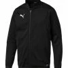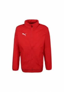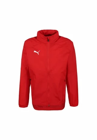 Mit dieser sportlichen Puma Liga Training Regenjacke bist du auch bei nassem Wetter auf und neben dem Rasen bestens geschützt. Die Jacke besitzt zwei verborgene Seitentaschen in denen du deine Kleinigkeiten sicher aufbewahren kannst. Der längere Saum hinten und die RipStop-Bündchen an den Ärmeln sorgen für Tragekomfort. Eine schützende Kapuze befindet sich im hochstehenden Kragen. Abgerundet wird diese Regenjacke mit einem Puma Cat-Logo in Kontrastfarbe auf der Brust.